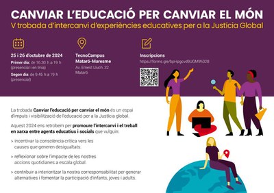 Els dies 25 i 26 d’octubre, Mataró acollirà la V trobada Canviar l’educació per canviar el món que abordarà els reptes educatius per fer front als conflictes i violències, presentarà 18 experiències educatives i ampliarà el seu programa per abordar el rol de l’associacionisme educatiu en l’impuls de l’educació per a la Justícia global.